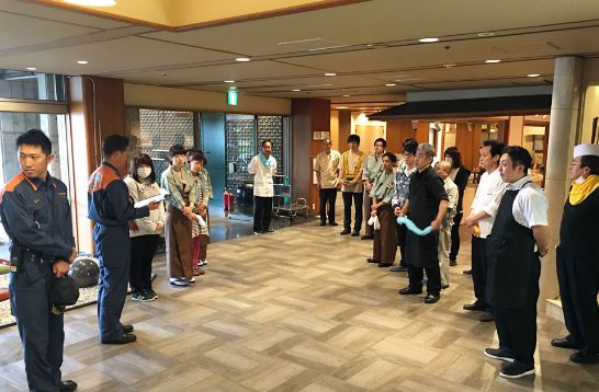 落雷がとても多いこの地域では、火災が起きやすいので避難訓練は怠れない。毎年4月と10月の昼と夜、本館と別館合わせて8回、宿泊客がいる営業中でも避難訓練を実施。日頃から防災意識を高めているおかげで地元消防団に加入した従業員も出てきている。「防災意識」を従業員の人事評価項目にも入れ、意識向上につとめている。