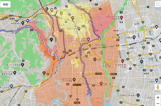 佐賀県小城市の防災ハザードマップを見ると、市内のほぼ全域に洪水のリスクがあることが分かる