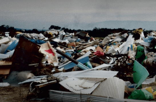 設立から30年、会社がある福岡県小郡市では約13年おきに大きな台風や豪雨災害に見舞われてきた。1991年(平成3年)の大型台風では60名以上の死亡者が出る事態となり、その時、小郡市内だけでも約500台の災害廃棄物を収集したと野﨑氏は語る。