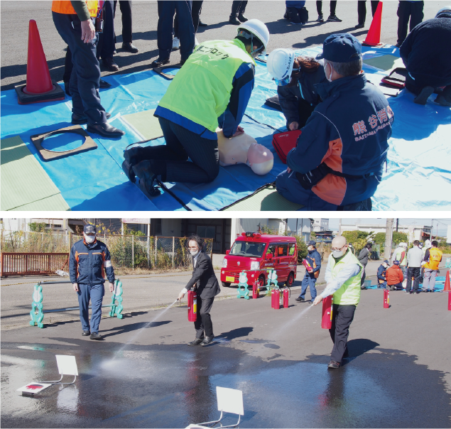 防災訓練では、基本的なパターンは変えずにマニュアルどおりに行動できることを確認しつつ、細かいメニューのみ毎年アレンジして、さまざまな災害のパターンに対応できる体制作りを進めています。具体的には消防署の応援をいただきながら消火器の使い方を学んだり、人形を使いガレキのなかから人を救出する実習を行ったり、テントや炊飯道具など、災害時に役立てるための備品を実際に設置、利用してみたりといった内容です。