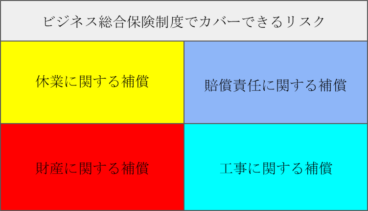 以上の4つが「ビジネス総合保険」における補償となります。各企業は、企業の業務内容に合わせた補償内容を選択し、モレ・ダブリのなく事業活動全般のリスクをカバーいただくことが可能です。