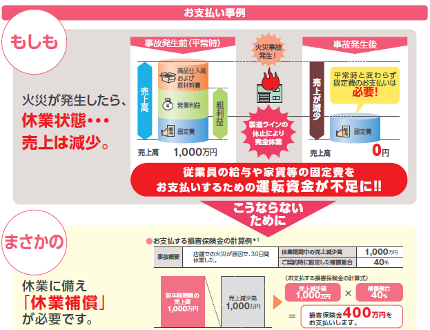 休業に関する補償では、企業が使用する建物等が損害を受け、休業することによって生じる売上高の減少を補償します。火災・自然災害により建物が被害を受け休業せざるを得ない場合は、事業が中断し売上がなくなることから、キャッシュが入ってこなくなります。ここで経営の大きな負担となるのが人件費をはじめとする「固定費」の支払いです。固定費は事業を中断している間も支出が必要となるため、現預金がどんどん目減りし、資金繰りは急速に悪化してしまいます。長期間にわたり事業が中断すると固定費の支払いに耐えられず、従業員を解雇せざるを得ない事態や最悪の場合、倒産に至ることも考えられます。