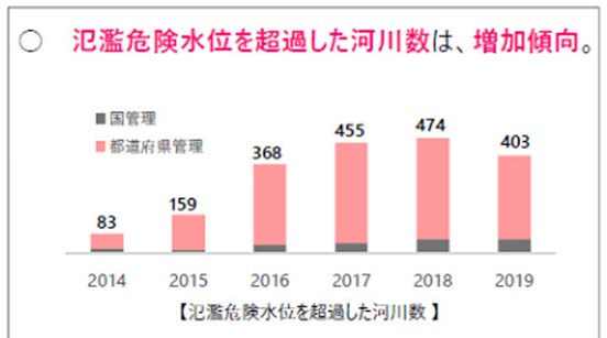 気候変動等の影響により大雨の発生頻度が高まっているのとともに、河川が流れ込む山裾から平野部に生活域が集中している日本の国土利用の事情により、洪水や土砂災害発生時に大きな被害が発生しやすい状況にあります。