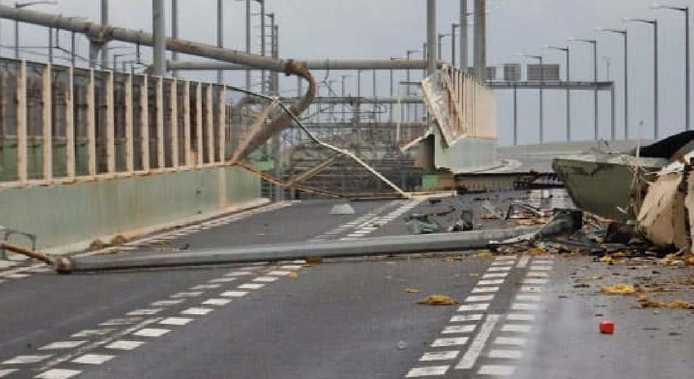 - タンカーが衝突し、通行できなくなった連絡橋(2018年9月4日、大阪府泉佐野市)=関西空港海上保安航空基地提供