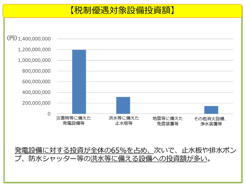 これによると投資額が最も多いのは発電設備等で、次に止水板等や排水ポンプ、防水シャッターといった
