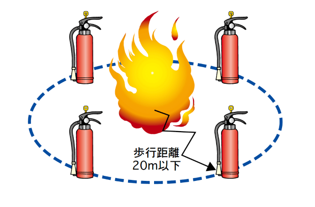 消火器は各防火対象物・部分から歩行距離20m以下(大型消火器は30m以下)になるよう設置し、各階ごとに設置すること