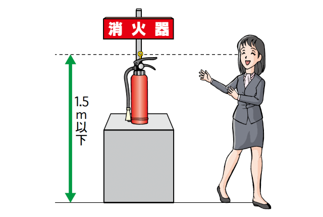 床面からの高さ1.5m以下に設置し、「消火器」の標識を見やすい位置に付けること。