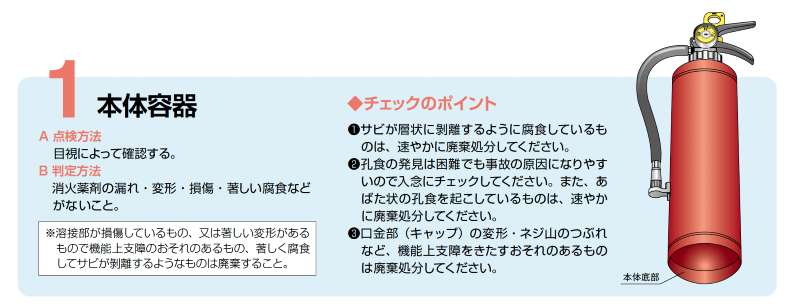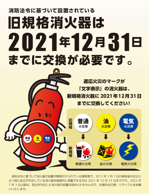日本消火器工業会・消防法令等に基づいて設置されている旧規格消火器は交換が必要です。