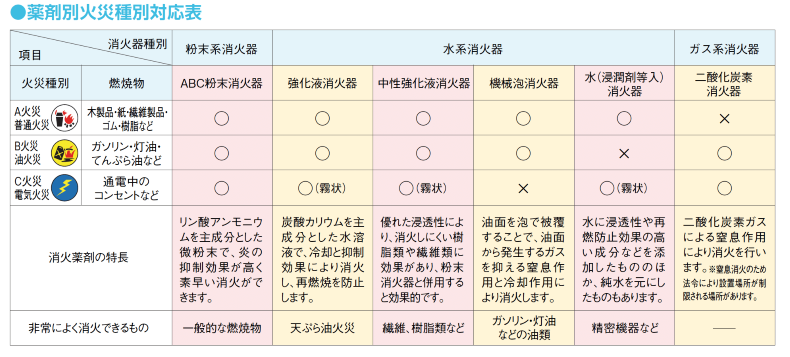 「消⽕器には、住宅⽤(家庭⽤)と業務用の2種類があります。設置義務がない事業者の場合でも、事業所での消火を想定して製造された業務用をお勧めしています。消⽕器の消火薬剤には粉末や⽔系(液体)、ガス系(二酸化炭素)といったものがありますが、一般的には幅広い⽕災に対応できるABC粉末消⽕器が設置されるケースが多いです。さらに⽕災の危険性が⾼い場所には⽔系消⽕器とセットで常備しておくと安⼼できます」(和田氏)