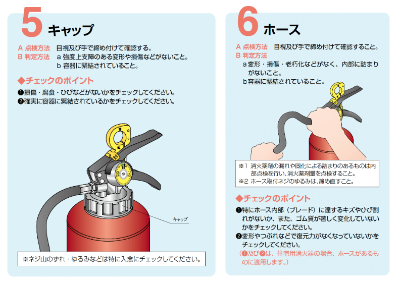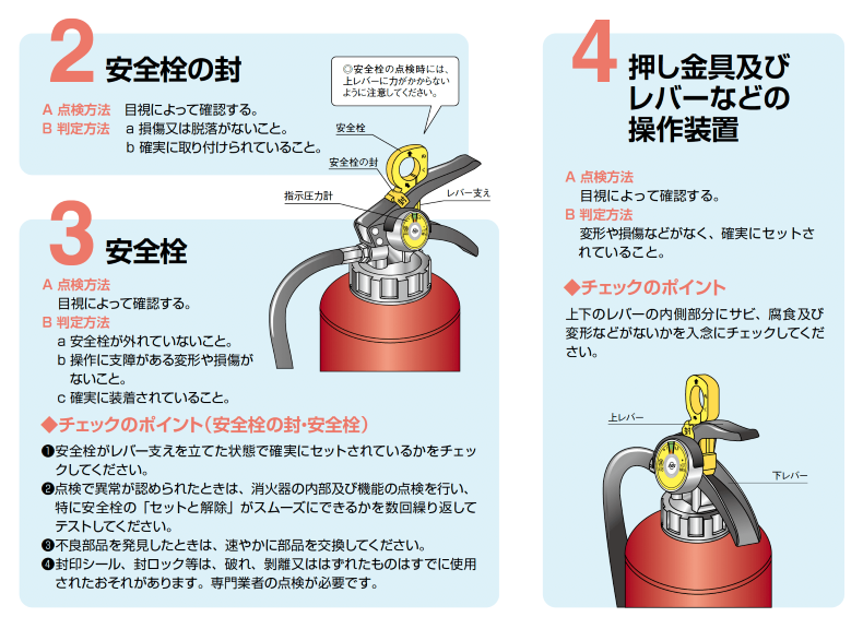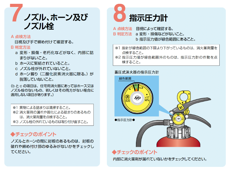 「このところ、BCP対策や事業継続⼒強化計画の策定で消⽕器の設置に積極的な事業者、経営者の⽅は増えていますが、消⽕器を設置するだけではなく、平時の維持管理はどうするか、火災が発生した場合はどういったオペレーションで鎮火活動をするのか、といったルール作りを決めておくことが大切です。消⽕器の操作は難しくありませんが、いざ⽕災が発⽣すると慌てて適切な消⽕活動ができなくなることがあります。そうしたことを避けるうえでも年に⼀度は防災訓練で消⽕器の扱い⽅を従業員の皆さんで確認してもらうのがいいでしょう。また、点検義務がない建物でも資料(下記)を参照して半年に1度程度は維持管理をしていただき、消火器が正常な状態にあるかどうか確認をしていただければ安心です」(和⽥⽒)