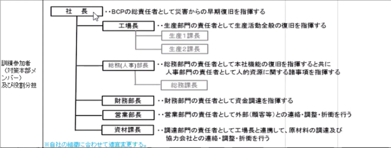 「災害が起きると社内の体制が混乱するので、災害時の役割を事前に決めておくのがいいでしょう。下記は一例ですが、このように社長以下、部門のトップが災害時における担当の責任者となって、それぞれが決められた担当の範囲で取り組めるようになります」(猿川氏)