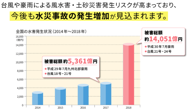 ここ数年、日本全国で、超大型台風や記録的な大雨、洪水、土砂災害等の水害による被害が急増しています。