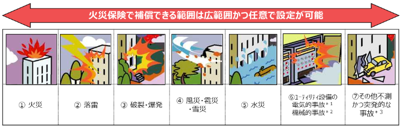 自社施設が損傷した場合の修繕や建て替え費用に対応する保険商品としては火災保険が代表的ですが、火災保険といっても補償できる事由は火災だけでなく、落雷や破裂・爆発、風災・雪災、水災、電気的・機械的事故など不測かつ突発的な事故まで幅広く対応しており、またこれらの罹災によって発生する利益補償や休業損害なども特約を付帯することでカバーできます。実際に経営者の方が望む補償内容が対象となっていなかったり、保険金額(契約金額)が不足している契約が存在しているため、まず自社の保険証券をご覧いただき、「補償内容が想定している範囲で設定されているか?」「想定される損害額に対し、支払限度額は適正か?」を確認することが大切です。