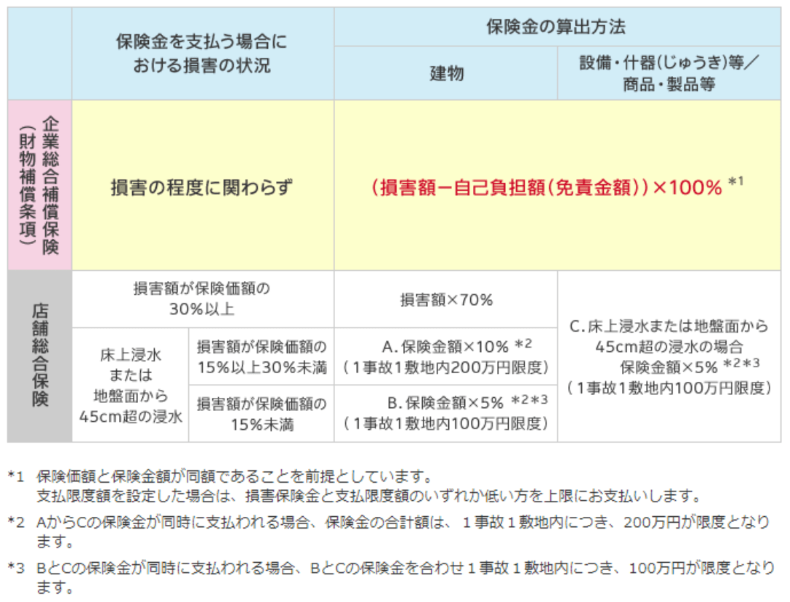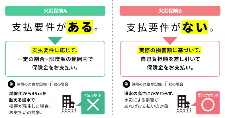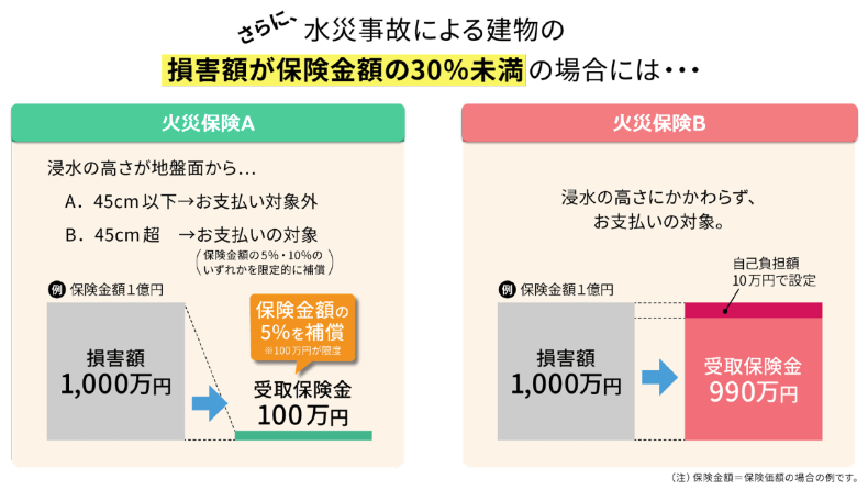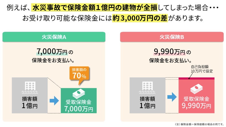例えば、1億円の建物が水災で全損してしまった場合、火災保険Aでは、水災事故による補償は最大70%までとなりますので、7,000万円が保険金として支払われます。一方、火災保険Bでは、損害額の1億円から自己負担額の10万円を差し引いた9,990万円が保険金として支払われ、2つの保険では支払保険金に約3,000 万円もの差が出ます。
