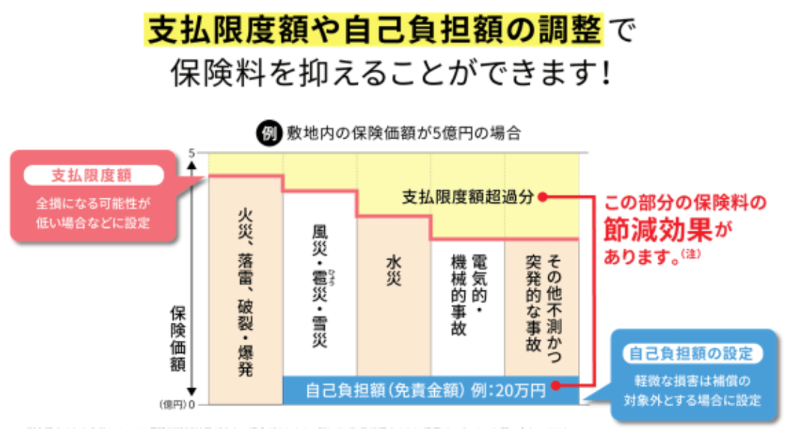 支払限度額や自己負担額を設定することで、保険料コストを抑えることも可能です。例えば、高所や河川が近隣にない事業所や工場、都心部に位置するビルなどの場合、水災のリスクは限定的であるため、補償を外したり、支払限度額や自己負担額を設定したりするなど、ある程度の損害額までは自己負担とし、企業財務上インパクトのある損失を火災保険でカバーするという考え方です。支払限度額や自己負担額を大きくすることで保険料は安くなりますが、自社のハザードマップを確認し、最悪の場合、自社にどの程度の損害が及ぶのか、といったことも踏まえて、慎重に検討する必要があります。