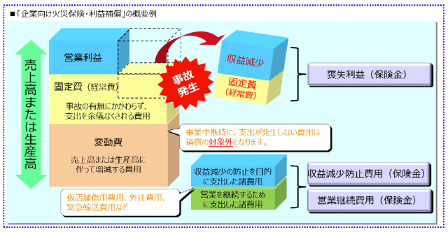 これまで挙げてきたものは、自社の建物や設備什器・製品など財物損害に対する補償でした。一方で、災害等により企業が被る損害はこれらの直接的なものだけでなく、利益損失や休業損害などにも及びます。会社の施設が損傷した場合、一定期間、事業を継続できないケースも想定されます。売上が減少するだけでなく、休業している間も人件費や賃料等の固定費は発生し続けます。会社や従業員を守る観点からも、休業に対する手当は極めて重要です。こうした、本来正常な営業活動によって得られるべき利益の損失(=事業中断リスク)も保険に転嫁できます。また、商品によっては、自社施設への直接的な損害だけでなく、例えば近隣への落雷で停電が発生し、自社の設備が停止したケースも補償対象となる場合があります。