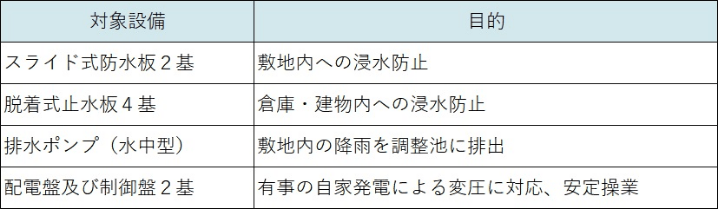 令和元年の台風第19号により油脂静岡工場(菊川市)近隣を流れる江川(牛渕川支流)が氾濫、ひざ下レベルの浸水で設備被害を受けたことを契機に、防災対策の必要性を再認識した。