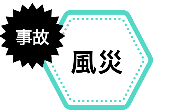 | 車両や建物外部からの衝突等 | 暴風雨により隣接する廃屋が倒壊。倒壊した廃屋の建材によって自社施設の外壁が損壊。修理が必要となった。 |