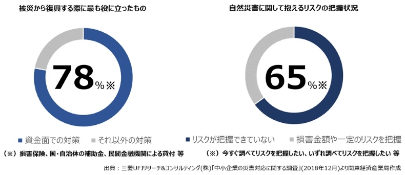 民間調査会社の調査結果によれば、被災から復興する際に役に立ったものの約8割は資金面での対策となっておりますが、他方で自社が自然災害に関して抱えるリスクについて、半数以上の65%の事業者は損害金額など一定のリスクを把握していない状況です。