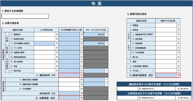 シートは地震と水災に係る自社のリスクをハザードマップから確認し、さらに決算書等の情報を基に休業期間中の運転資金や復旧にかかる資金、調達可能な資金を入力することで、災害発生時の自社の資金の状況を簡易的に算定することができます。(注)