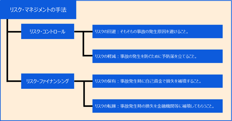 一般にリスク・コントロールをしてもリスクは残っており、事故が起きてしまった場合に、資金を調達する方法をリスク・ファイナンシングといいます。リスク・ファイナンシングにも大きく2つの手法があります。