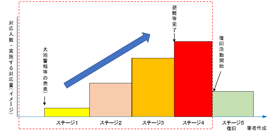 台風や豪雨による水害・土砂災害は、天気予報や進路予想、降雨量等の情報をもとに、事前に早期帰宅や被害軽減措置を行い、被害を最小化することが可能な災害である点が、事前の予兆がなく突然発生する地震災害とは異なります。また、気象庁・国土交通省や市町村等からの勧告等に応じた対応も求められます。このため、水害・土砂災害への対応は。図のように状況の進展に応じて、段階的に対応することが基本となります。