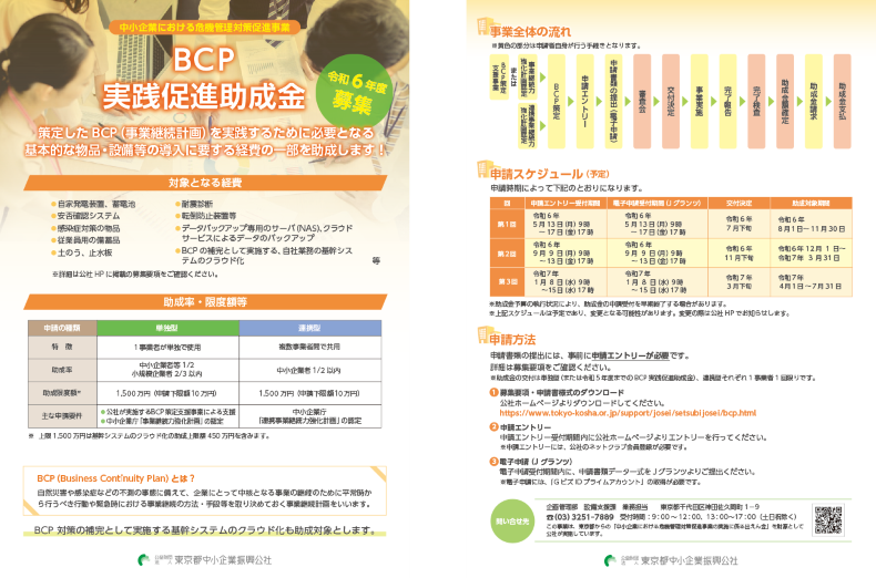 東京都中小企業振興公社では『BCP実践促進助成金』を実施しています。概要は、助成上限額1,500万円、助成率1/2以内(小規模企業者の場合は2/3以内)となります。例えば、BCP実践のための助成対象経費が500万円の場合、中小企業者の場合、250万円が交付決定額となりえます。