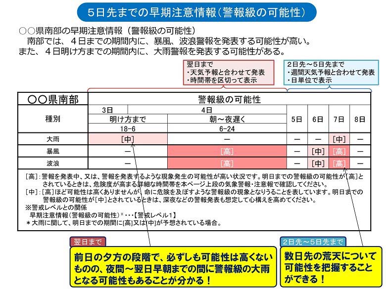 警報級の現象が予想されるとき、気象庁HPの警報・注意報の頁に「早期注意情報(警報級の可能性)」が発表されます。図2は早期注意情報の説明図です。早期注意情報は毎日5時、11時、17時に「高」「中」の2段階で可能性が示され、時系列に見ることができます。また、警報・注意報が出ていないときでも、5日後までにその可能性があれば発表されます。
