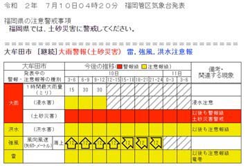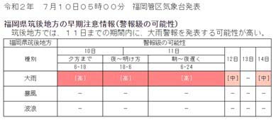 出典:気象庁HP:「気象警報・注意報」から7月10日発表、大牟田市の例