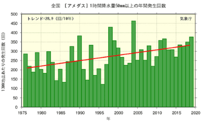 地震だけでなく、激しさを増す気象。自然災害のリスクは高まる一方です。低地に人口が密集、山間地で過疎化が進んでいる日本では災害は拡大します。「日本国内の大雨及び短時間強雨の発生頻度が増加している」