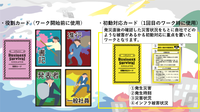 中小機構では、令和6年度、全国10カ所でジギョケイの認定を受けた事業者を対象にして、このカードゲームを使ったワークショップを開催しました。その時に使用したカードゲームの印刷原稿や、ワークショップで使用する教材一式を、中小企業強靱化ポータルの専用ページに掲載しています。カードゲームは、主に水害・地震を題材にしており、発災直後の状況が書かれた「初動カード」、発災翌日の状況が書かれた「災害カード」、災害カードと一緒に引く「インフラカード」、そしてディスカッションの役割を決めるために「役割カード」から構成されています。詳細は専用ページをご覧ください。