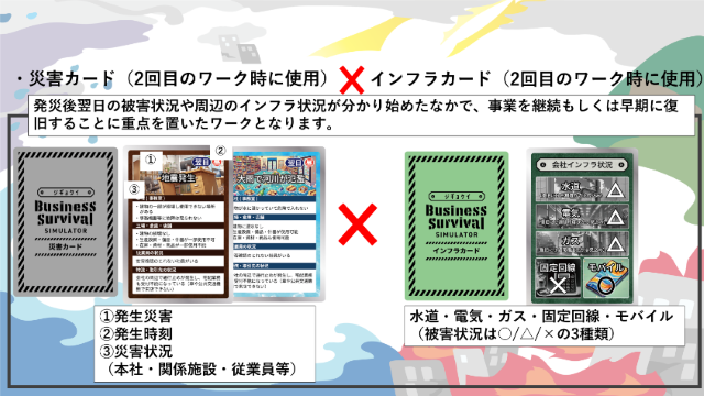 そこで、発災直後やある程度時間が経過して状況把握はできた段階での自社への影響について、できるだけリアルに状況を経験し、対策について検討することで、社員の防災・減災に対する意識を高めるとともに、ジギョケイをより自社の実態に合った計画に見直すための訓練を行えるのがカードゲームを使ったディスカッション型の訓練です。